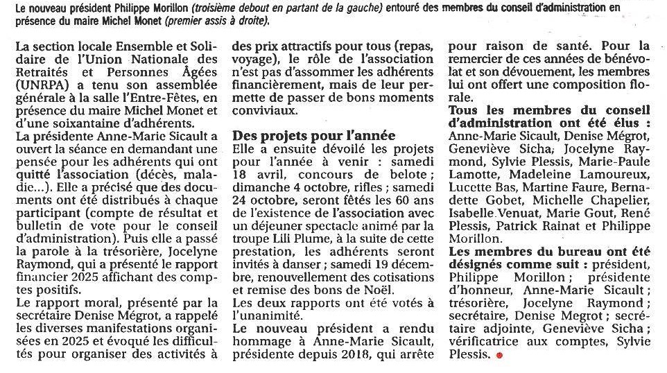 L' Assemblée Générale de la Section de GARCHIZY (Nièvre) s'est déroulée le Jeudi 5 Mars 2026 avec renouvellement du Président, et c'est Mr MORILLON Philippe qui succède aujourd'hui à Mme SICAULT Anne-Marie, laquelle occupait le poste depuis près de 18 ans. Une magnifique composition florale lui a été offerte par le bureau en présence de Mr Le Maire de la Commune Michel MONET. La Section composée de 112 adhérents fêtera ses 60 ans d'existence le 24 Octobre 2026 avec repas spectacle. Ci-joint un bel article dans le journal du Centre mettant à l'honneur Ensemble et Solidaires-Unrpa et ses responsables.
