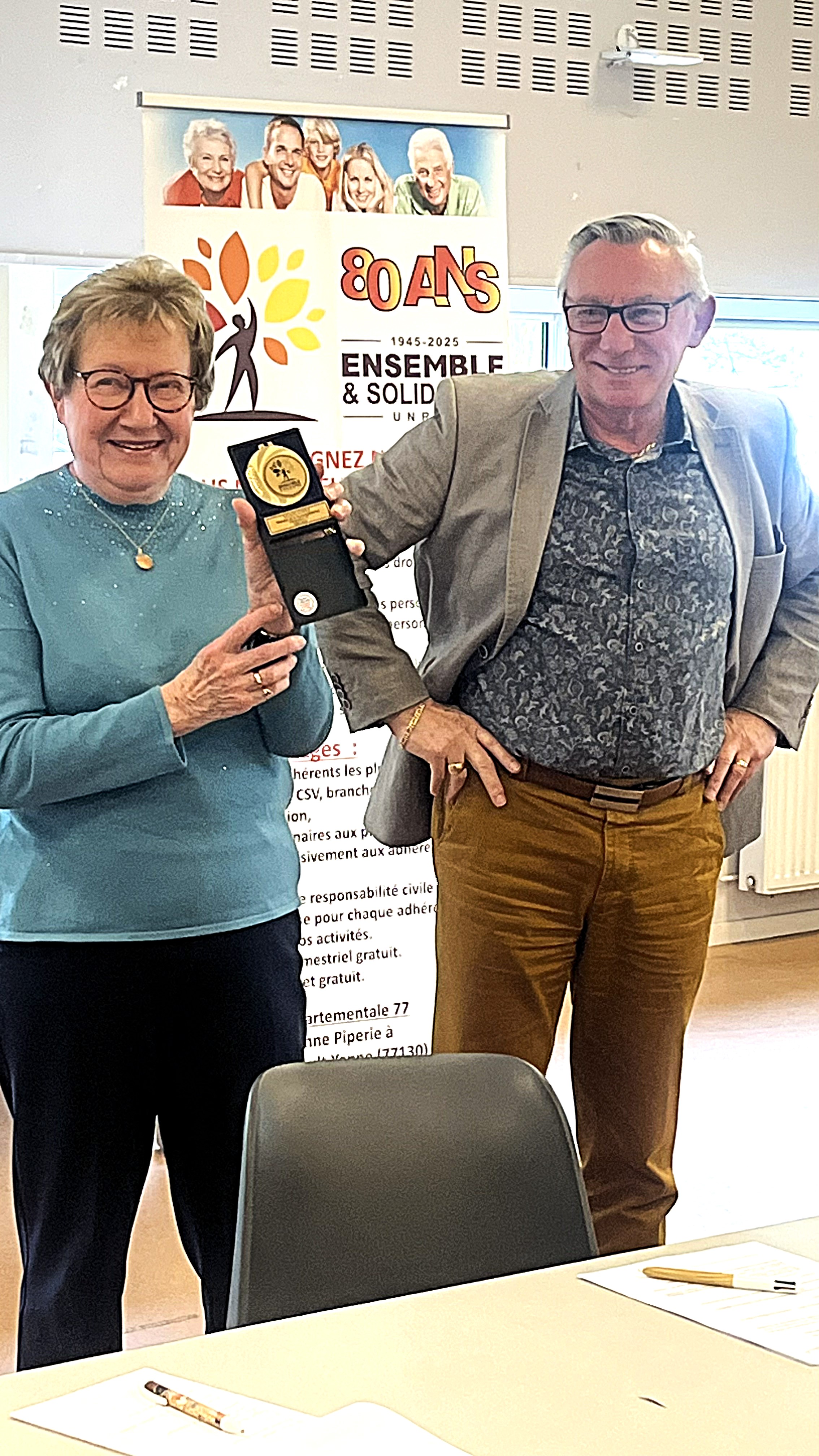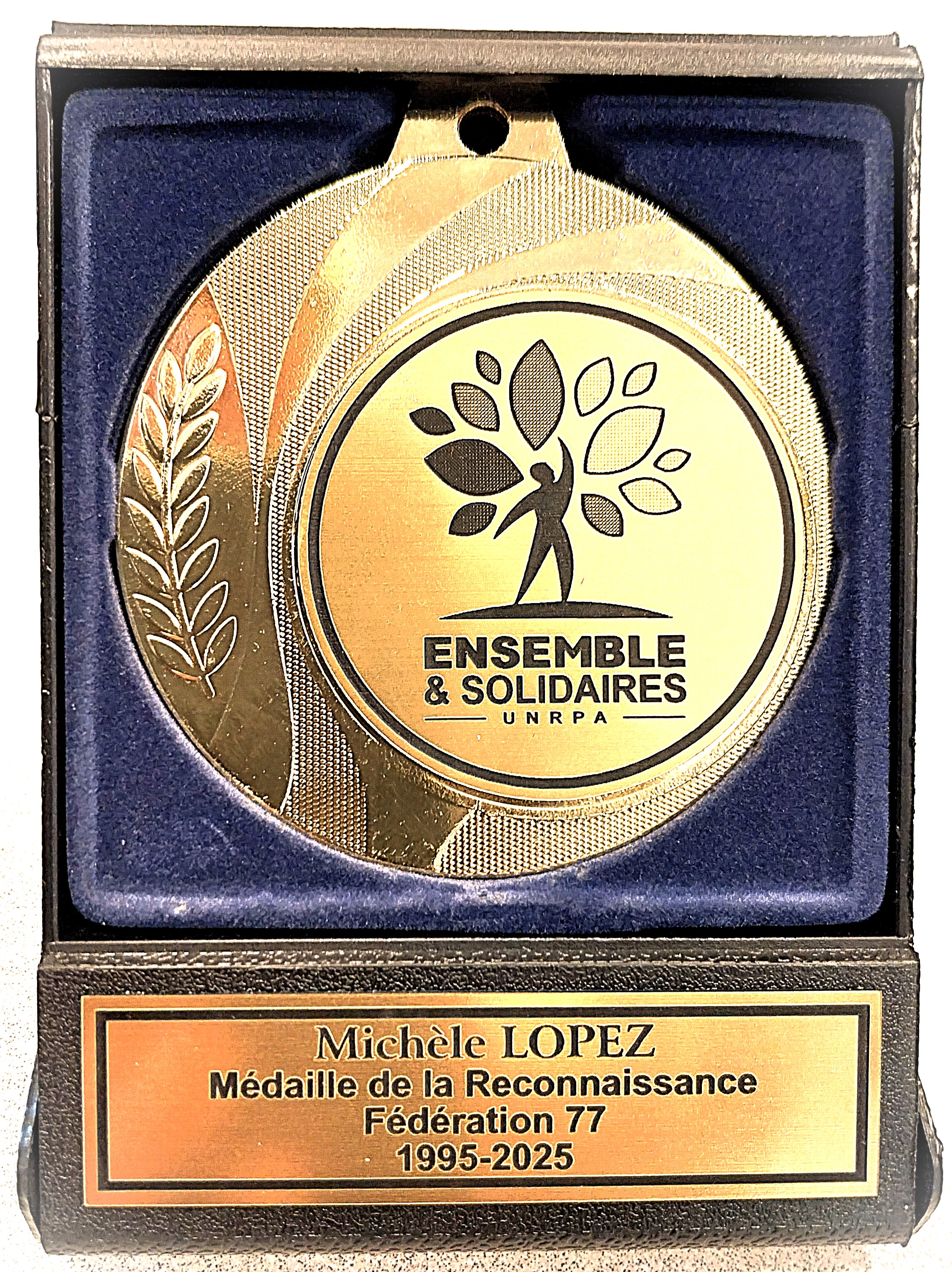 Ce fut aussi l'occasion pour Michel GENNERAT le Président de la Fédération Départementale de mettre à l'honneur Michèle LOPEZ, qui a été Co-Présidente de la Section de Mitry, et adhérente à ES-UNRPA depuis plus de 30 ans, en lui remettant au nom de notre Président National R. PERRET la Médaille de reconnaissance UNRPA pour toutes ces longues années d'engagement et de dévouement aux profit des retraités de notre association.