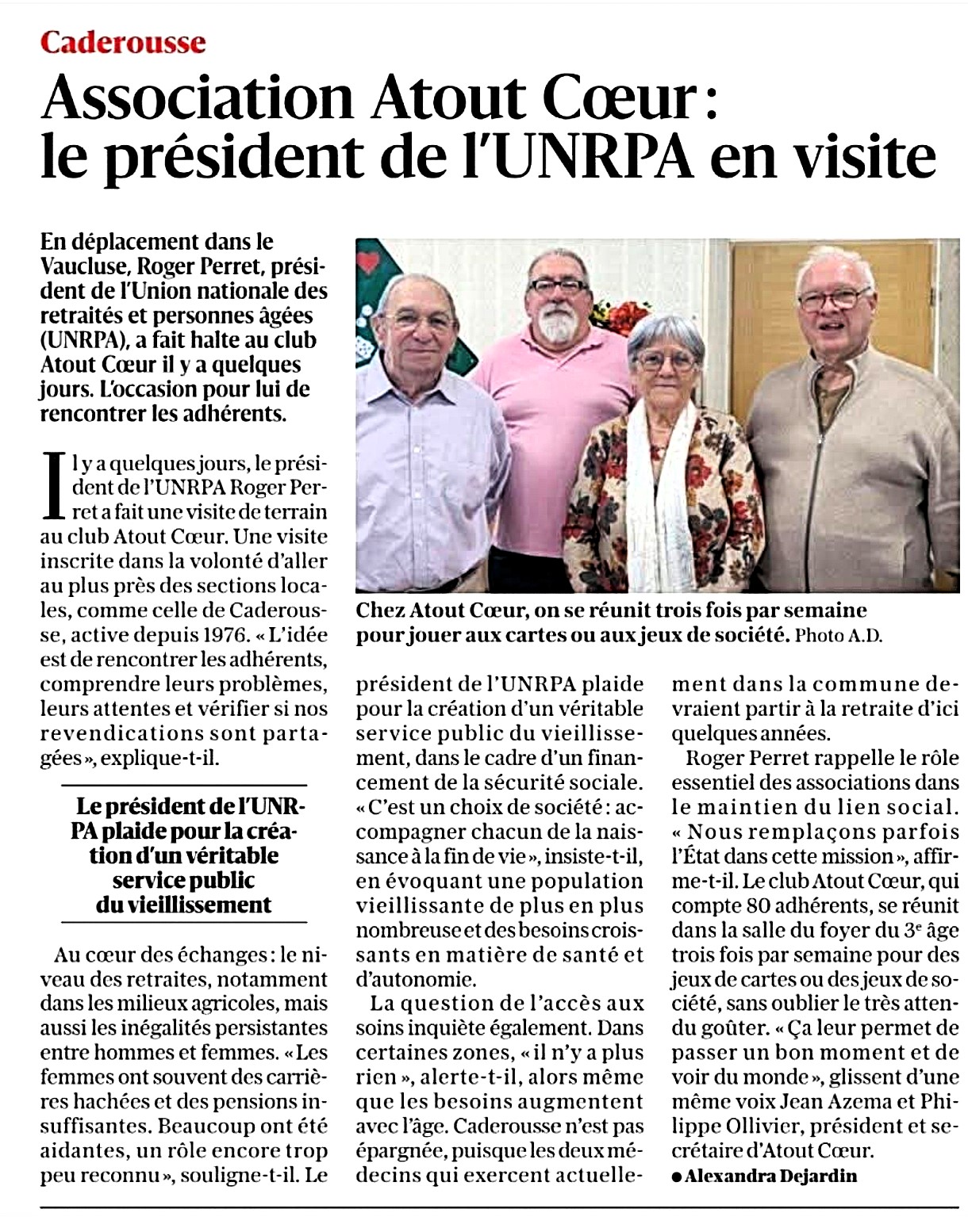 Le Président National Roger PERRET a rencontré les adhérents de la Section de CADEROUSSE (84) le 27 mars 2026, dans leur village de 2800 habitants près d'ORANGE. Section qui compte 80 adhérents (dont 4 nouveaux), avec une activité hebdomadaire soutenue comprenant 3 rencontres par semaine. Dans les locaux mis à disposition par la municipalité, le Maire de la commune était présent pour cette rencontre. Roger PERRET a pu répondre aux adhérents présents aux diverses questions posées, laquelle est née en 1976 et fêtera ses 50 ans. Moment agréable de partage et de convivialité.